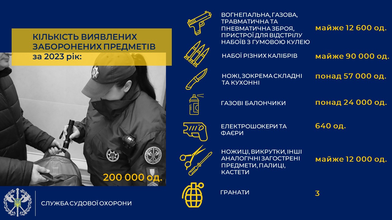 Служба судової охорони на своєму вебсайті оприлюднила звіт про свою діяльність у 2023 році. Служба судової охорони продовжує протидіяти посяганням на судочинство та забезпечує належну охорону всіх учасників судових. *** ВИЯВЛЕНА ЗБРОЯ З початку 2023 року на період відвідування громадянами судових установ не допущено до пронесення майже 200 000 заборонених предметів. Співробітники Служби судової охорони постійно слідкують за дотриманням правил безпеки під час відвідування судових установ. Так, з 01 січня 2023 року за час регулярних перевірок у громадян було виявлено понад 5 000 одиниць вогнепальної зброї, майже 7 000 пристроїв для відстрілу патронів, споряджених гумовою кулею, майже 90 000 патронів. А також різні види пневматичної, газової та травматичної зброї, понад 57 000 ножів. Бити, палиці та кастети, піротехнічні засоби, майже 25 000 газових балончиків, електрошокери, майже 12 000 загострених предметів. Крім того, вироби імітаційного характеру, які за своїм зовнішнім виглядом ідентичні зброї та боєприпасам, 3 гранати та 7 спроб пронесення наркотичних речовин.