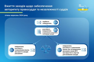 Протягом трьох кварталів 2024 року до ВРП надійшло 174 повідомлення про втручання у професійну діяльність суддів щодо здійснення правосуддя та дії, що порушують гарантії незалежності суддів або підривають авторитет правосуддя. З урахуванням повідомлень, які надійшли в попередні періоди, Рада з початку цього року розглянула 190 повідомлень суддів.