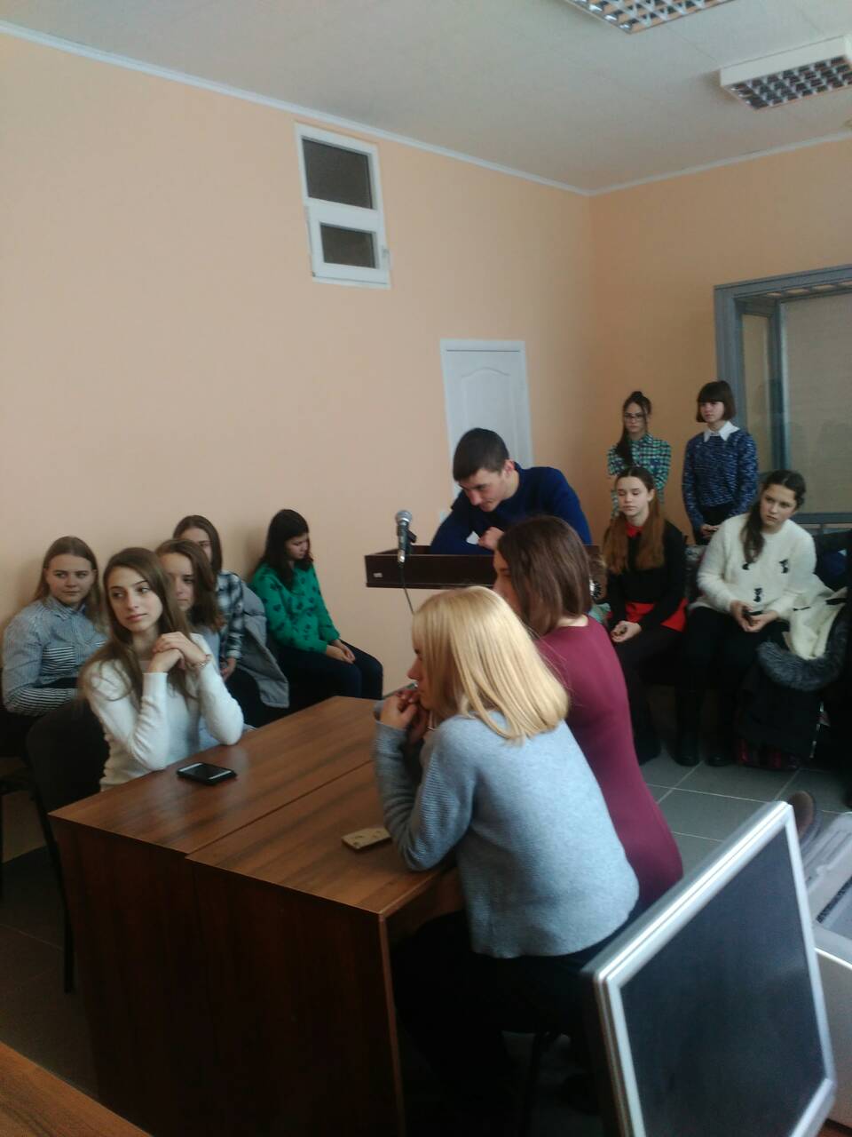 Першим кроком цього ознайомлення стало відвідування зали судового засідання, де з учасниками заходу провів бесіду голова суду Шелюховський М.В., який одразу ж запросив до себе у крісло судді старосту класу. Він розповів про роботу судді, категорії справ, які розглядаються в місцевих судах, про загородження, яке відокремлює обвинувачених (підсудних), засуджених від складу суду та присутніх, що відповідає європейським стандартам, про розгляд справ за участі присяжних та ін. Дав відповіді на запитання дітей та вчителя.
