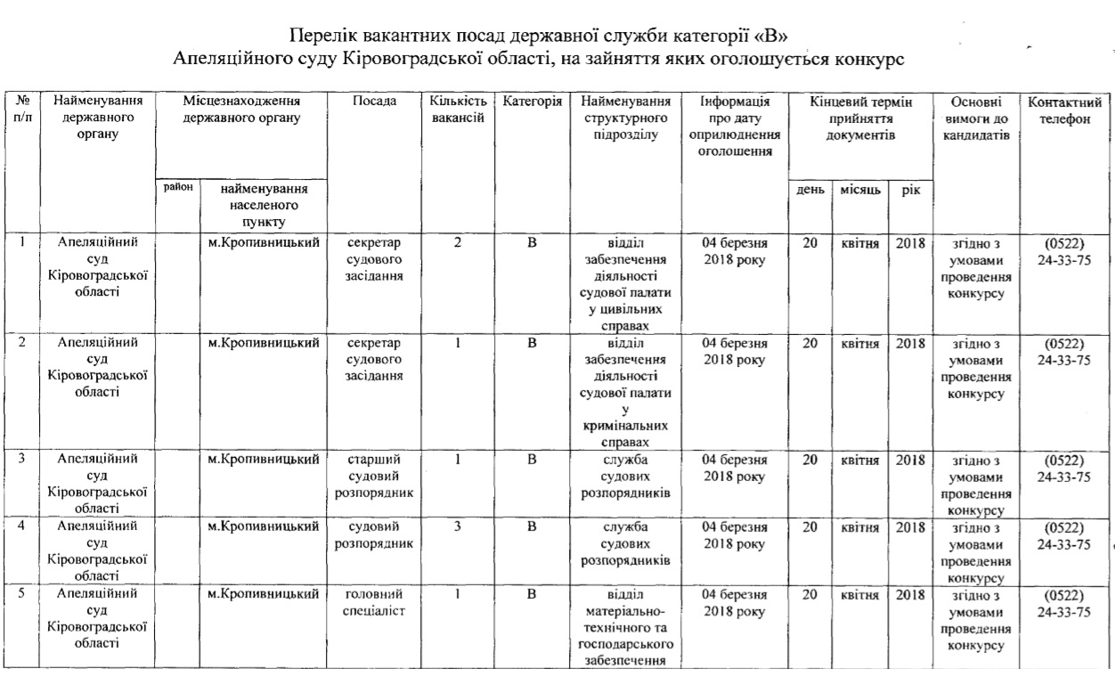 Відповідно до наказу керівника апарату від 4 квітня 2018 року №30-а/к Апеляційний суд Кіровоградської області оголошує конкурс на зайняття вакантних посад згідно переліку.