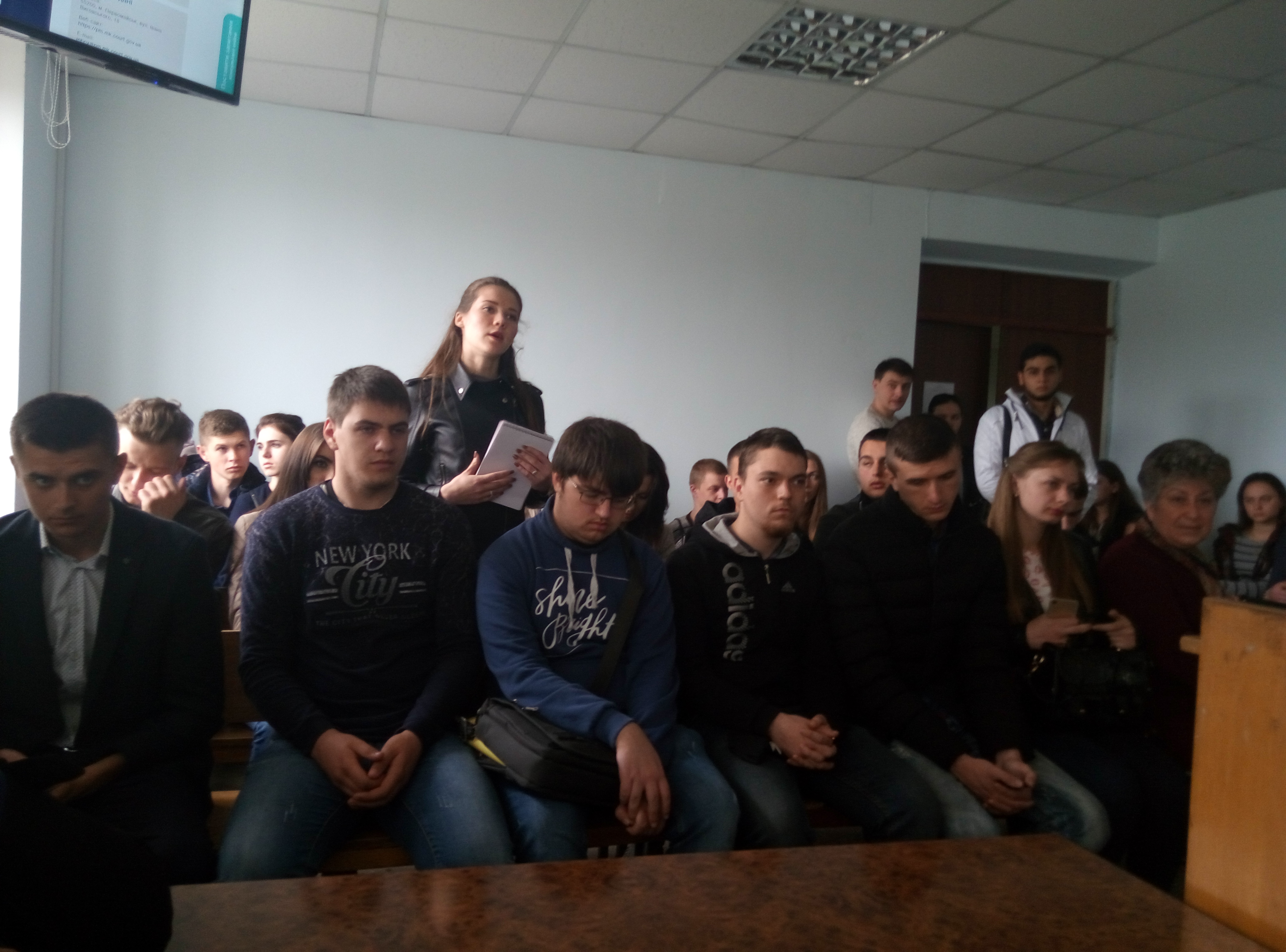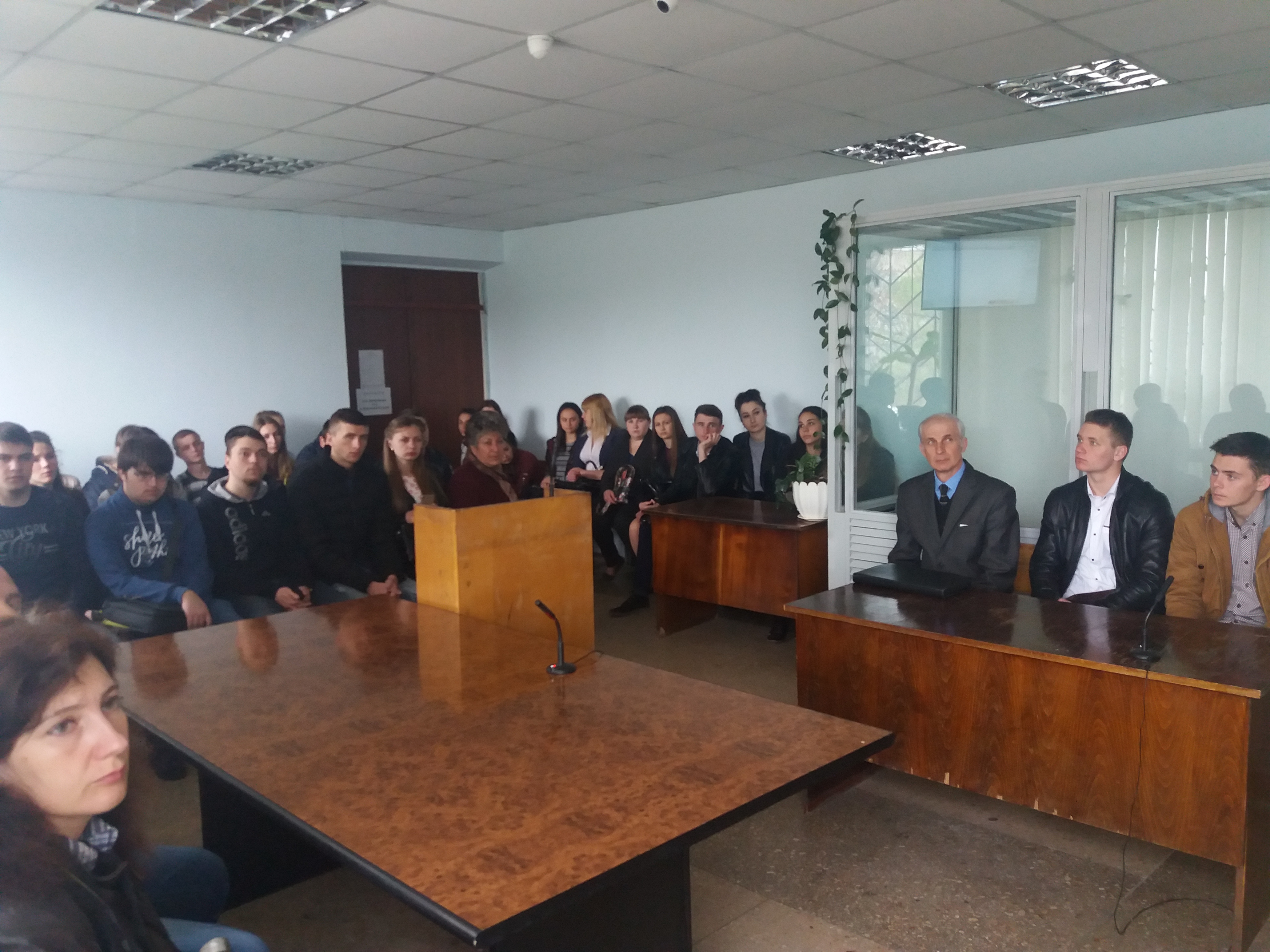 Коли всі студенти розмістилися у залі, Тетяна Яківна розповіла про те, як розподіляються справи між суддями, у якому вигляді надходять до суду та які умови висуваються до сучасного обладнання залу засідань. З порядком роботи у комп’ютерній програмі Д-3, порядком реєстрації справ різних категорій, ознайомив провідний спеціаліст з інформаційних технологій Беженуца О.І. Також, було оглянуто веб-сайт суду, продемонстровано судове засідання у режимі відеоконференцзв’язку. Секретар судового засідання Лянгорт З.О. розповіла студентам про засоби фіксування судового процесу.