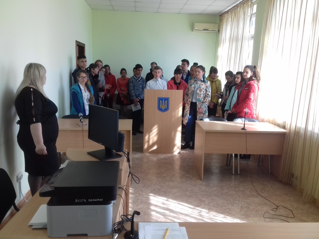 Відкрила захід керівник апарату суду Чернова-Наріжна Оксана Анатоліївна, яка розповіла про історію створення суду, його діяльність, про те, як здійснюється організація роботи апарату Іванівського районного суду Одеської області, які вимоги до працівників та яка відповідальність покладена на них. Також, ознайомила учнів з правилами поведінки в суді та провела гостям невеличку екскурсію судом.