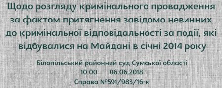 Для інформації: колишній прокурор прокуратури м. Сум С. обвинувачується в тому, що своїми умисними діями, які полягали в притягненні 27 січня 2014 року завідомо невинуватих Т.О., Т.Ю. і 28 січня 2014 року завідомо невинуватого К. до кримінальної відповідальності, поєднане з обвинуваченням у вчиненні тяжкого злочину, а також поєднане з іншою фальсифікацією, вчинив злочин, передбачений ч. 2 ст. 372 КК України.