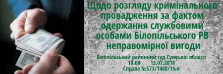 Розгляд кримінального провадження стосовно колишнього начальника кримінальної міліції Білопільського РВ УМВС України в Сумській області Г., обвинуваченого за ч. 3 ст. 368 КК України, та колишнього старшого оперуповноваженого сектору карного розшуку Білопільського РВ УМВС України в Сумській області Є., обвинуваченого за ч. 3 ст. 368, ч. 2 ст. 365 КК, відкладено на 10 годину 13 липня 2018 року. У судовому засіданні будуть досліджуватися письмові докази.