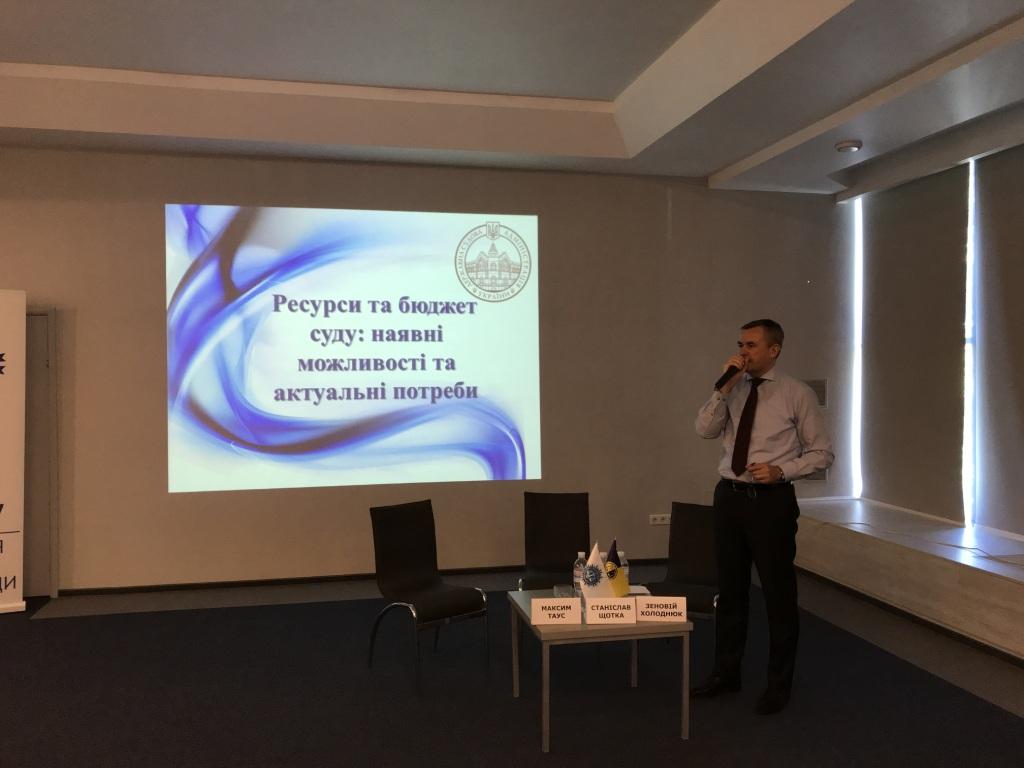 Виступ Голови Державної судової адміністрації України Зеновія Холоднюка на тему: "Ресурси та бюджет суду: наявні можливості та актуальні проблеми" присвячений питанням фінансового забезпечення системи правосуддя України, рівню задоволення потреб системи правосуддя, забезпеченню судів засобами інформатизації та належними приміщеннями.