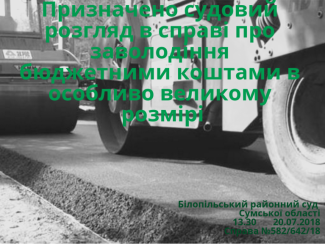 Для інформації: особа обвинувачується в тому, що виконуючи ремонт доріг на території Курманівської сільської ради Недригайлівського району Сумської області, знаючи, що до запланованих витрат при ремонті дорожнього покриття включена вартість улаштування підстильних і вирівнювальних шарів основи з піску, фактично таких витрат не здійснив і заволодів коштами в сумі 520728 грн., що в 650 разів перевищує неоподатковуваний мінімум доходів громадян.