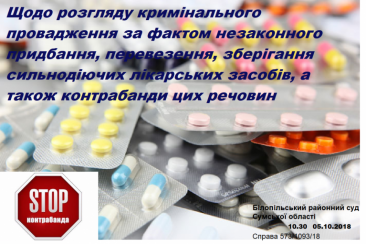 Для інформації: особа обвинувачується в тому, що восени 2017 року в мережі Інтернет замовив і отримав у одному з відділень ТОВ «Нова пошта» з метою збуту в м. Москва 11 упаковок по 100 таблеток у кожній упаковці «Метандієнон» та 7 упаковок по 10 ампул у кожній упаковці «Нандролон Деканоат». 12 квітня 2018 року останній перевіз з м. Суми до пункту пропуску «Рижівка» митного поста «Білопілля» зазначені препарати, обрав спрощений режим митного контролю «зелений коридор», під час проходження якого умисно не повідомив працівників митниці про приховані в особистих речах препарати.