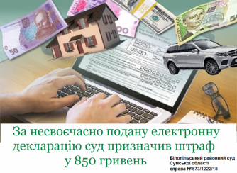 Так 3 квітня 2018 року депутат Білопільської районної ради Щ. несвоєчасно без поважних на те причин подав декларацію особи, уповноваженої на виконання функцій держави або місцевого самоврядування.
