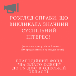 Зважаючи на те, що з боку благодійного фонду "НА БЛАГО ОДЕСИ" надійшло клопотання про забезпечення проведення судового засідання у залі місткістю до 150 осіб, вказана справа викликає значний суспільний інтерес.