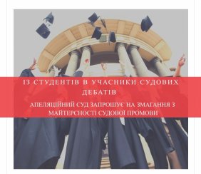 Апеляційний суд Хмельницької області 12 жовтня 2018 року запрошує студентів 2-6 курсів юридичних та неюридичних факультетів до участі у змаганнях із майстерності судової промови – судових дебатах з цивільного права та процесу. Дебатери мірятимуться ораторською силою в умовах, наближених до реальних - у залі судового засідання. Команди оцінюватимуть професійні судді.